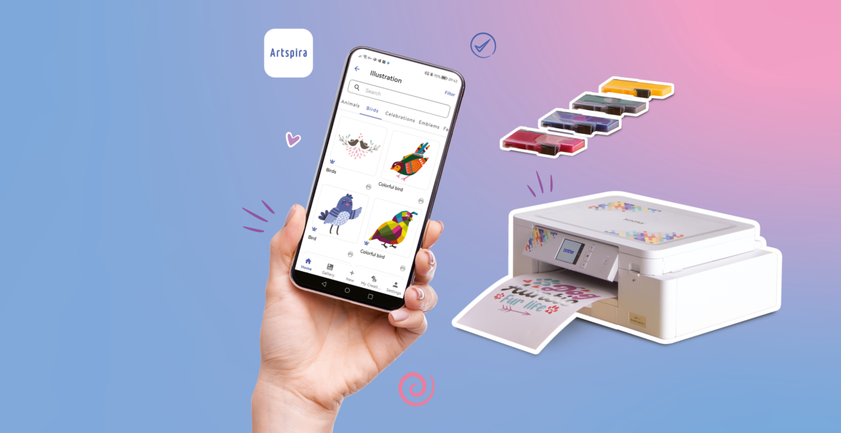 Que vous souhaitiez lancer une nouvelle activité, ajouter une compétence à votre micro-entreprise ou tout simplement explorer l’univers de la personnalisation, l’imprimante Brother SP-1 est votre partenaire idéal. Connectez-la à l’application Artspira* pour accéder à une vaste bibliothèque de motifs d’impression, d’outils d’édition et bien plus encore.